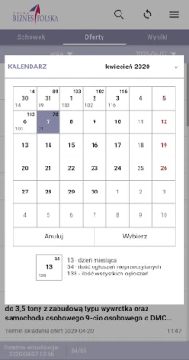 - Obok nazwy profilu widnieje data raportu z ogłoszeniami (domyślnie bieżąca). Kliknięcie w datę powoduje wyświetlenie kalendarza. Użytkownik może wybrać dowolny dzień, z którego następnie zostaną wyświetlone ogłoszenia.